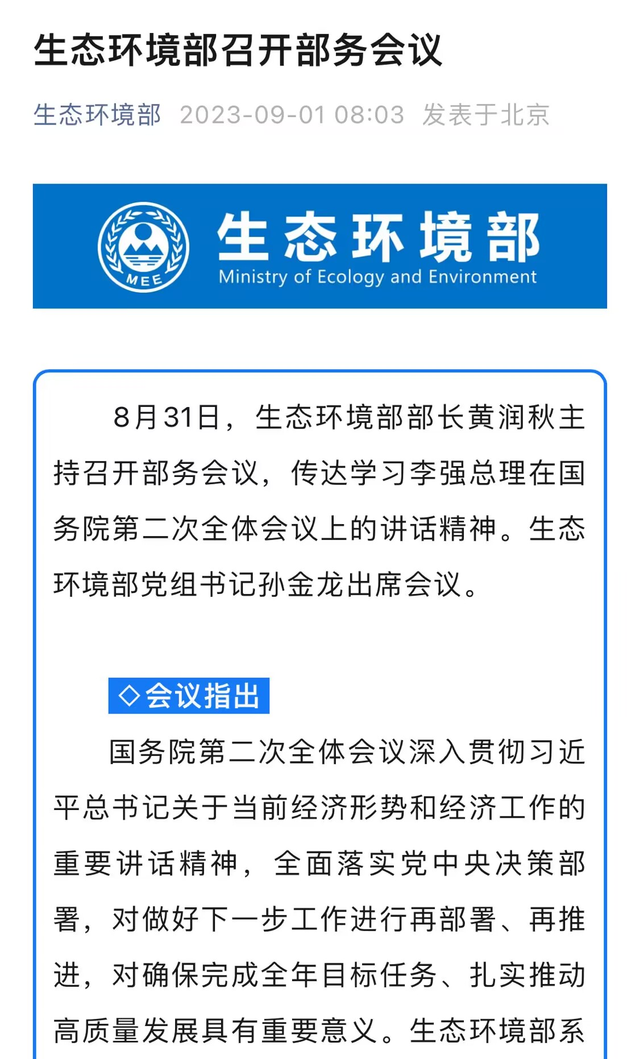 接下来,我们再来说说第二个好消息。在设立民营经济发展局这一消息发布前几天,生态环境部也表达了类似的积极态度。8月31日,生态环境部召开了部务会议,会议内容主要是要实现既定目标,同时还要全力服务保障经济运行持续回升向好。简单来说,国家对生态环境项目的投资将会增加,而且明确表示要服务民营经济发展,也就是说会促进民营环保企业的发展。