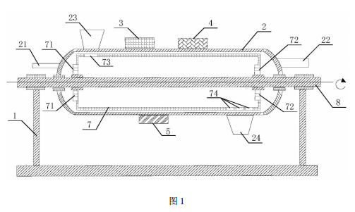 优选地,还包括 :加热罐 7 和罐体转轴 8 ;壳体进料口 23 设于壳体 2 左端的顶部,而壳体出料口 24 设于壳体 2 右端的底部 ;加热罐 7 设于壳体 2 的内部,并且加热罐 7 上对应壳体进料口 23 的位置设有罐体进料口 73,而对应壳体出料口 24 的位置设有罐体出料口74 ;加热罐 7 的左侧端面上设有罐体进气口 71,而加热罐 7 的右侧端面上设有罐体出气口72 ;