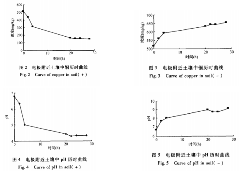 土壤的pH值变化原因主要在于电场作用下,水溶液中的H+和OH-同时向两极移动并发生电解使两极附近发生pH值变化,即在阴极附近H+被消耗而在阳极室OH -被消耗,因此阴极室pH值升高而阳极室pH值降低。另外,可能由于H+向阴极区迁移的速率高于OH -向阳极区迁移的速率以及电极端水的电解导致的氢离子和氢氧根离子的富集,使得实验中阴极室pH升高程度高于阳极室pH值降低的程度。当H+向阴极室迁移的迁移带与OH-向阳极室迁移的迁移带相遇时发生中和反应而使土壤的pH值变化较小。而且由于pH值的升高使得重金属离子在阴极附近土壤中还可能形成沉淀,降低土壤重金属的迁移和去除效率。