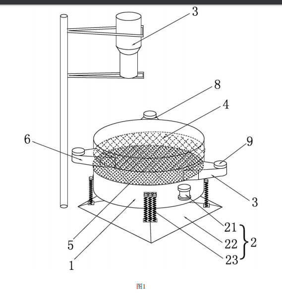 传统的土壤筛分设备通常只具有简单的筛分功能,对于一些特殊的产品,如吸水珠,一 般的筛分设备在筛分过程中吸水珠容易吸潮,吸潮后自身会膨胀数倍,体积变大,导致吸水 珠无法穿过筛网。另外,由于部分产品具有一定的粘性,在筛分时容易粘在筛网上,积累较 多后会堵塞过滤孔,较难清理,容易导致直径较小的产品无法过滤掉,严重影响了产品的成 品率。 为了克服上述现有技术的不足,本实用新型提供了一种烘干土壤筛分设备,其不但能 够防潮,还可以防止过滤孔堵塞。